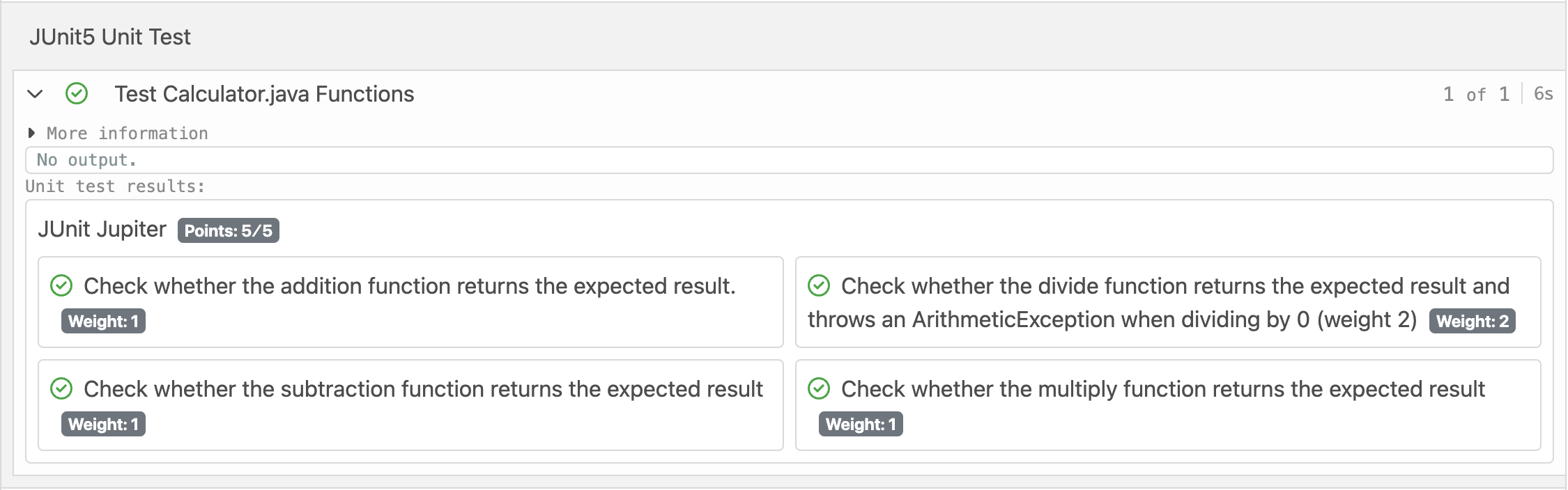 To make running JUnit5 tests in CodeGrade simpler, we created the **Junit5** block. This can be used to install JUnit5, automatically compile and run your JUnit5 test cases, or fetch the JUnit5 Jar files to run JUnit5 with your own custom specifications.