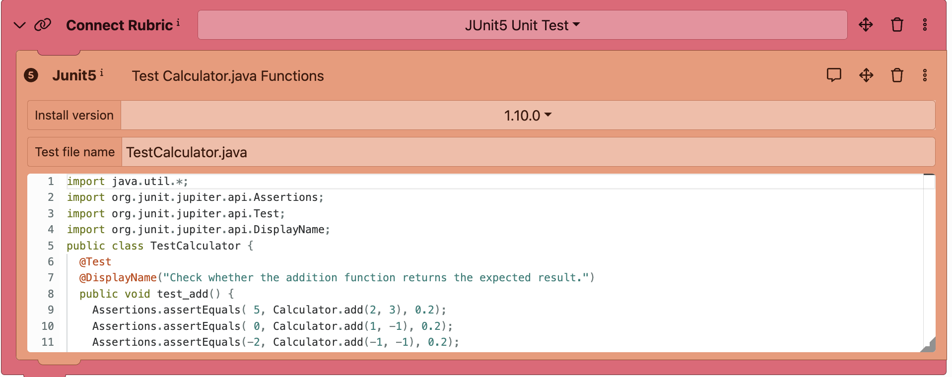 3. Copy the contents of your JUnit 5 test file (e.g., `TestCalculator.java`) and paste them into the Junit5 block's editor.