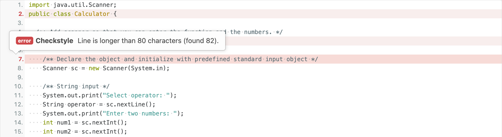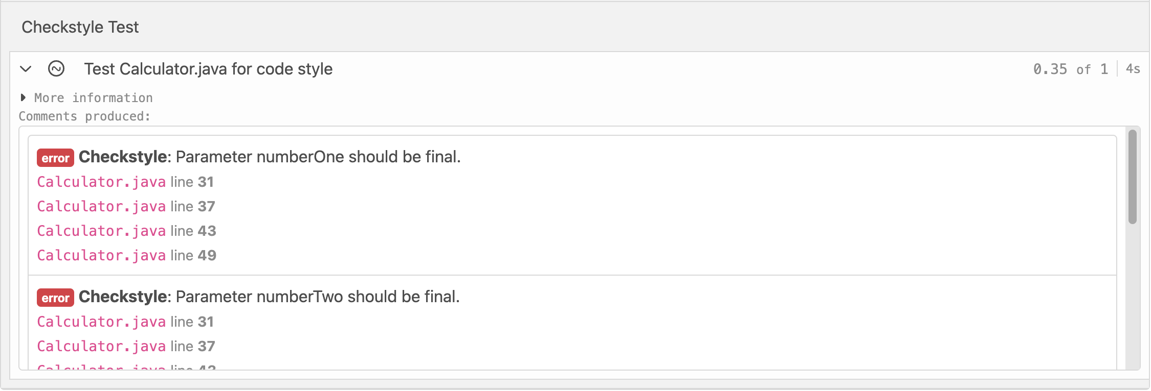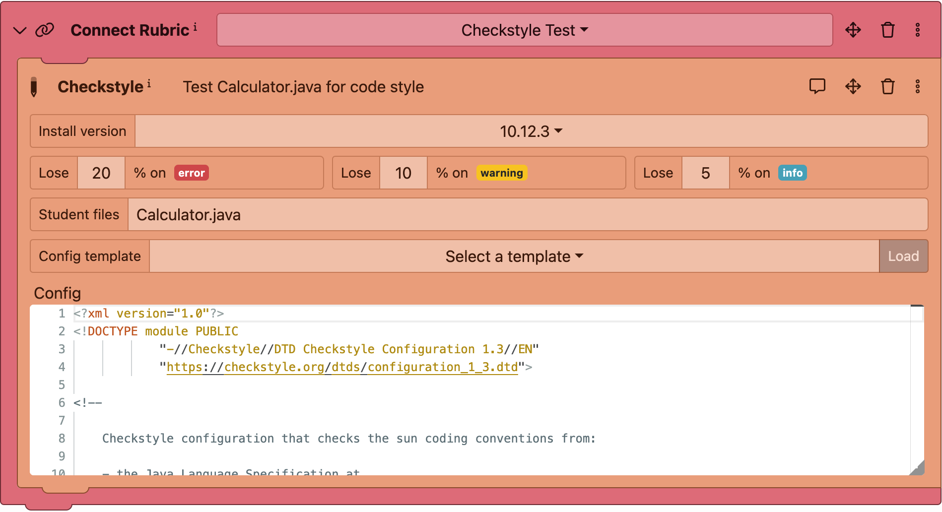 The **Checkstyle block** is an off-the-shelf testing tool that doesn't require any additional setup or configuration other than providing the name of the file to be tested. The Checkstyle block generates comments directly on students' code. Each target line is highlighted according to the severity of the comment and the comment can be read by hovering over the line number with the mouse cursor. The Checkstyle block also works in the built-in editor making it a powerful combination for beginners.