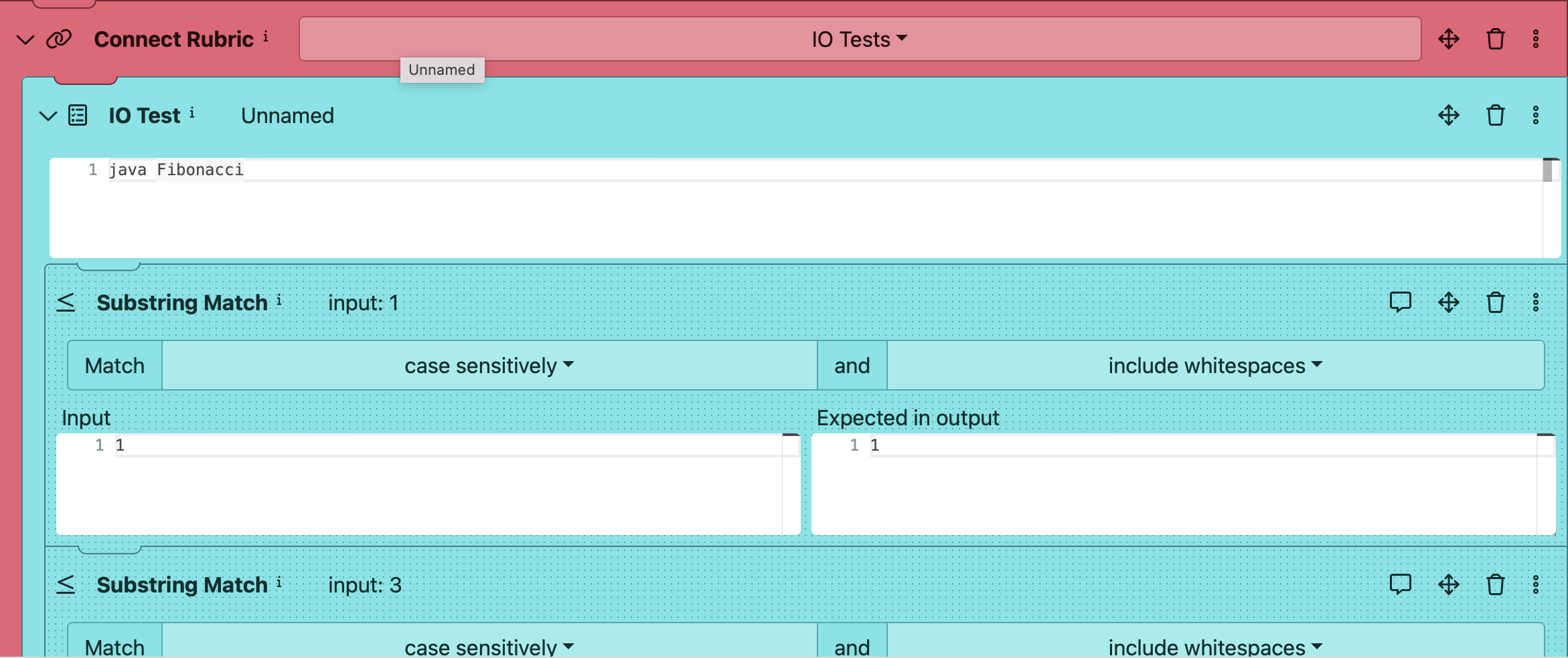 2. Add an **IO test** block to your AutoTest configuration and nest it in the Connect Rubric block. Run the compiled java file by writing the command `java Fibonacci` in the provided editor.