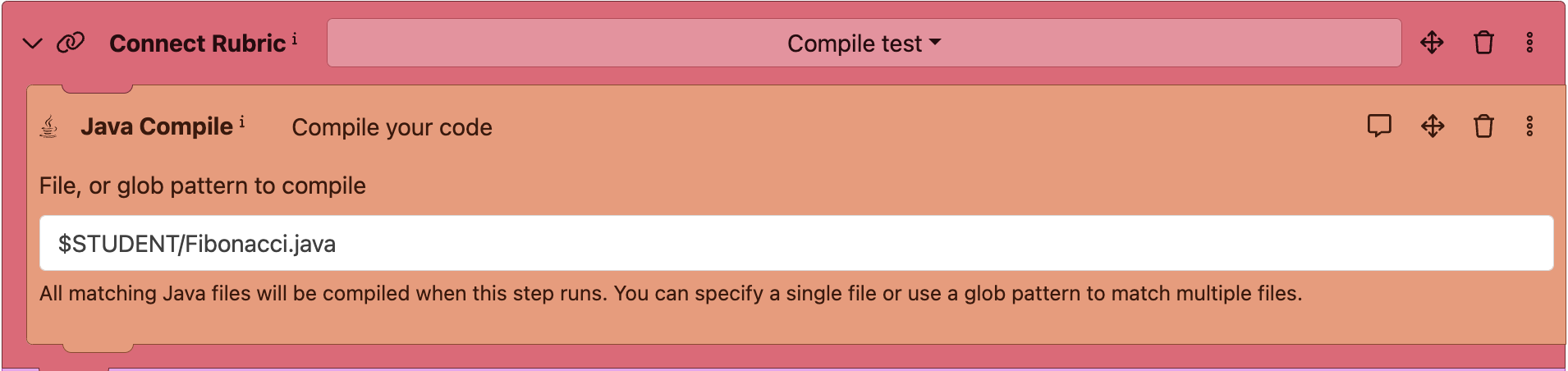 3. Add a **Java Compile** block to your AutoTest configuration and nest it within the **Connect rubric** block.