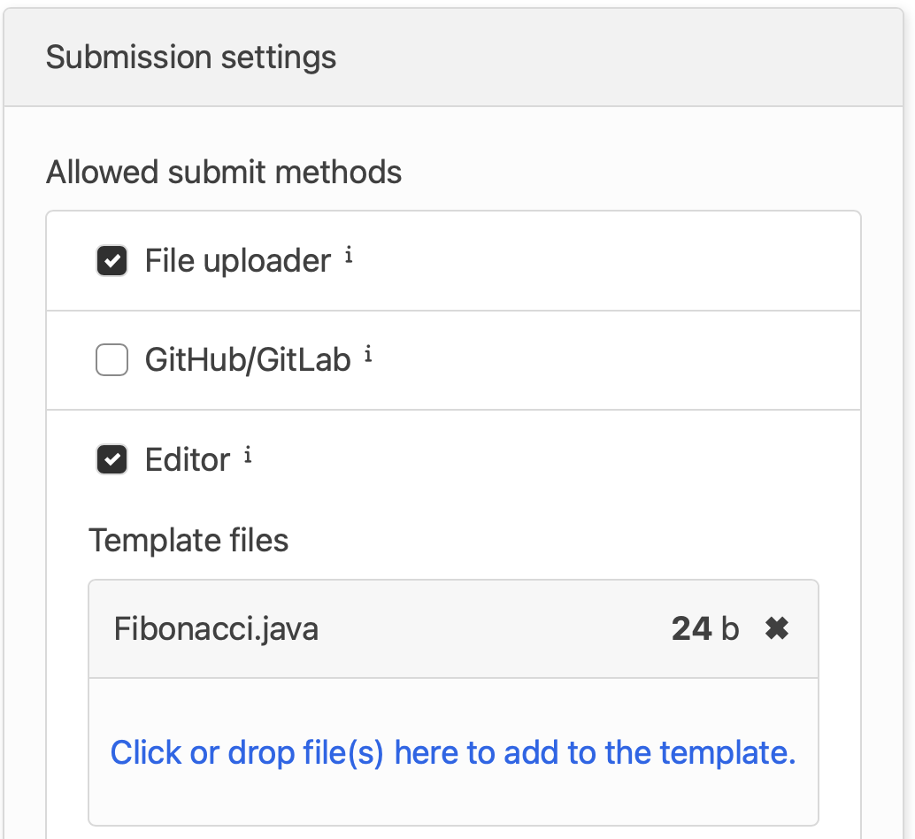 4. Enabling the Editor will reveal the **Template files** option. Unzip the Fibonacci.zip folder and upload Fibonacci/Template/Fibonacci.java as the template.