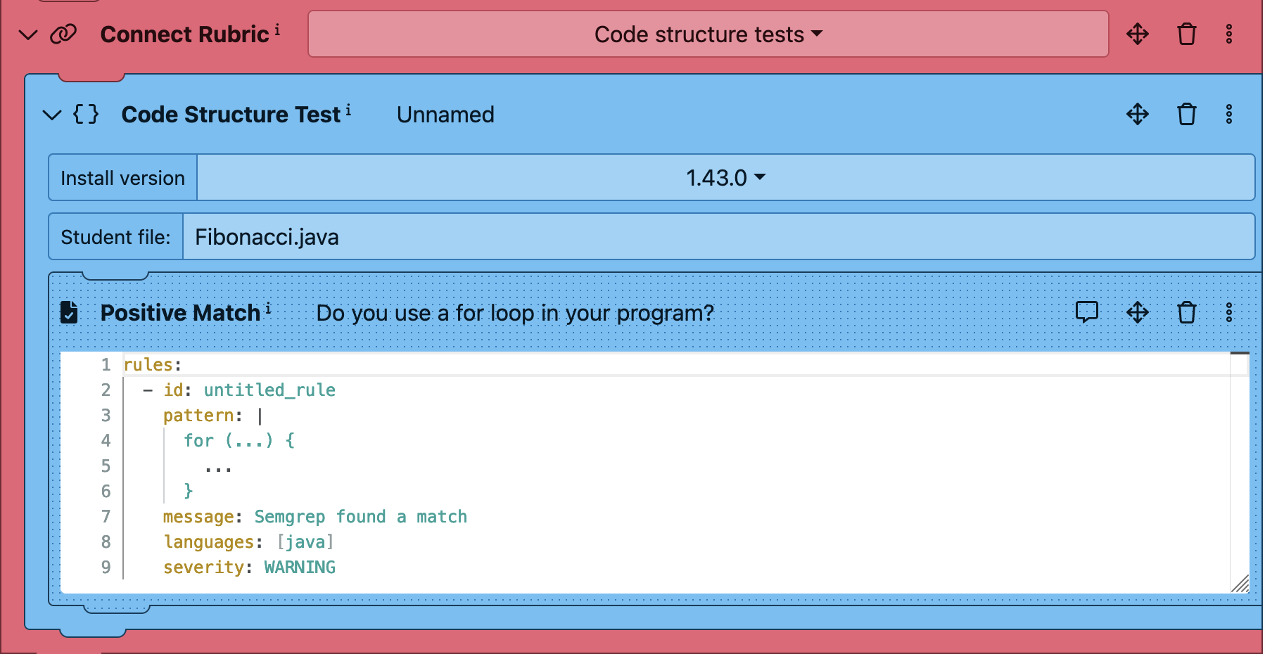 For this example we want to check that the students have used a for loop as part of their solution. Here is the Semgrep rule we will be using to check for this loop: