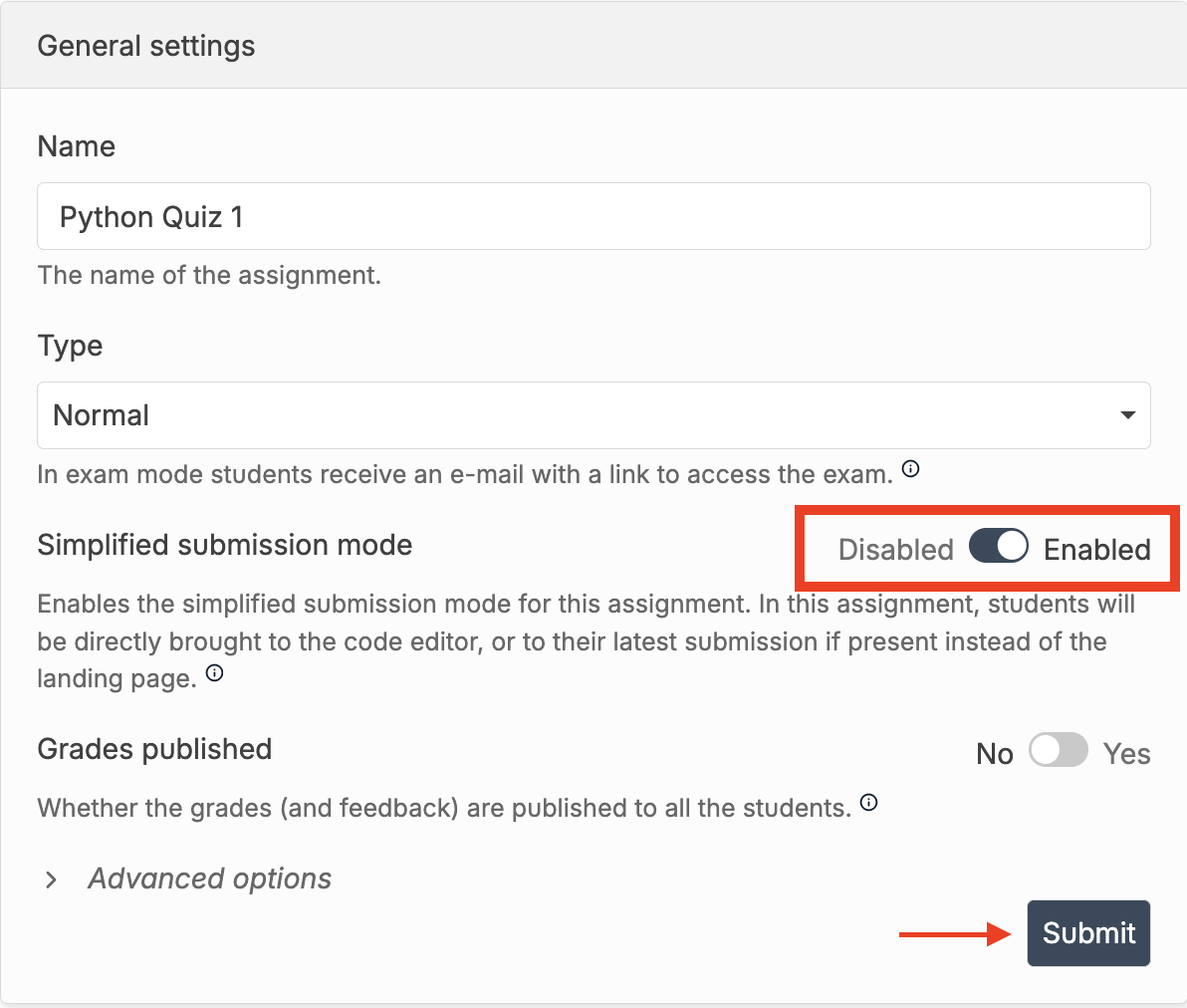 * **Type:** Make your assignment a "Normal" assignment or an "Exam". Exam mode offers some convenient features for hosting exams in a controlled environment.
